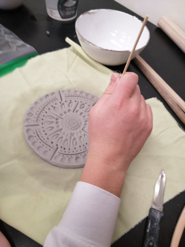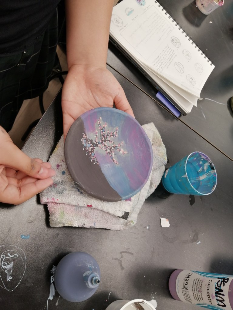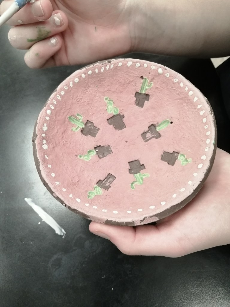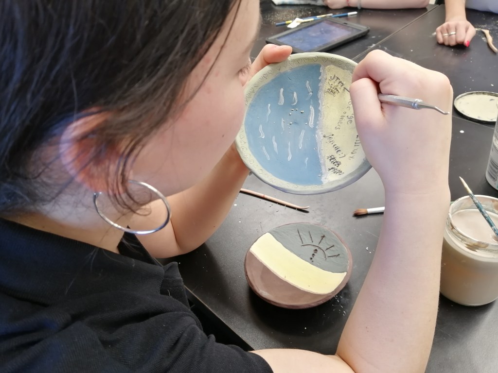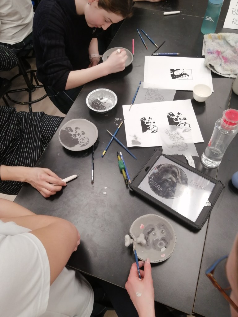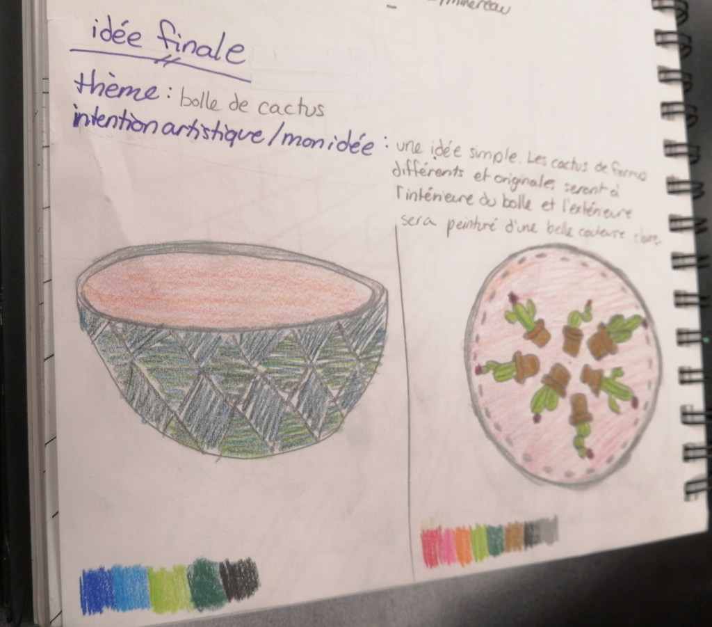Etape de la couleur et de la gravure. Certaines élèves ont anticipé le dessin qu’elles voulaient graver dans le bol. entre projection et résultat, intéressant!