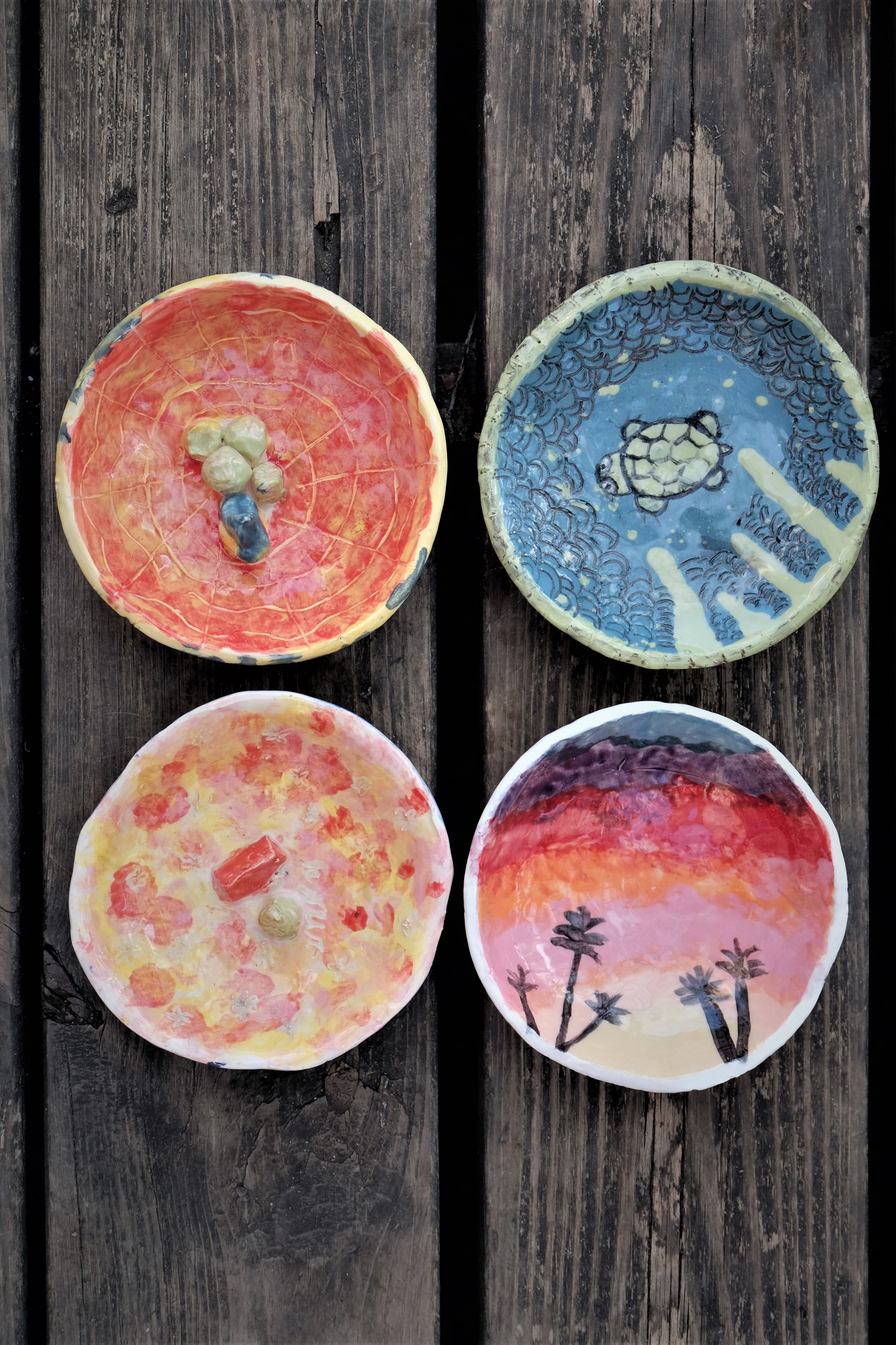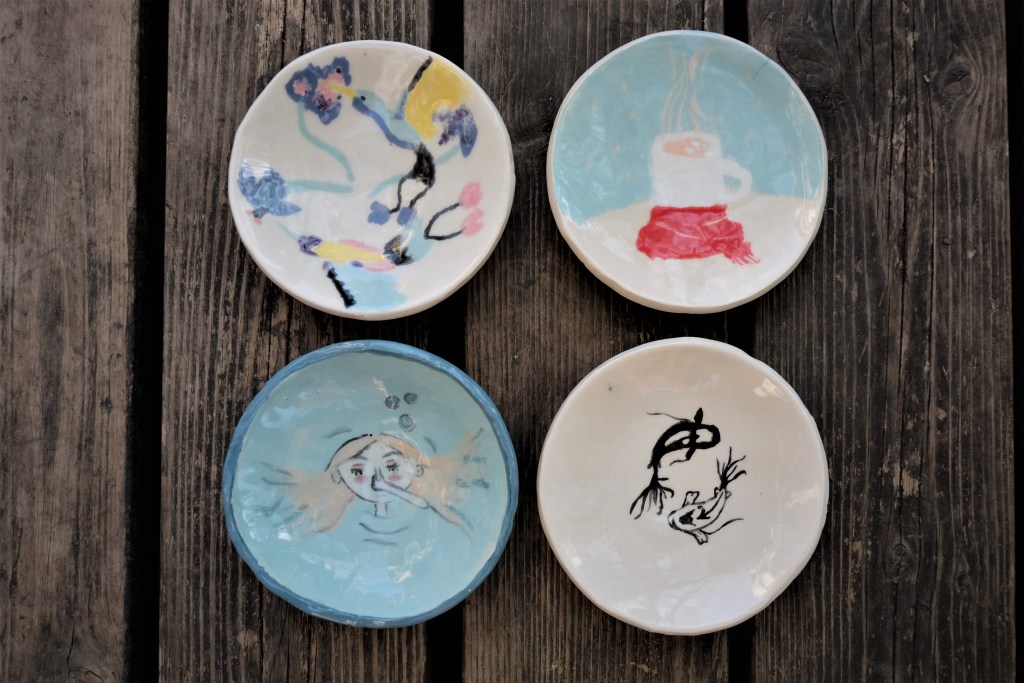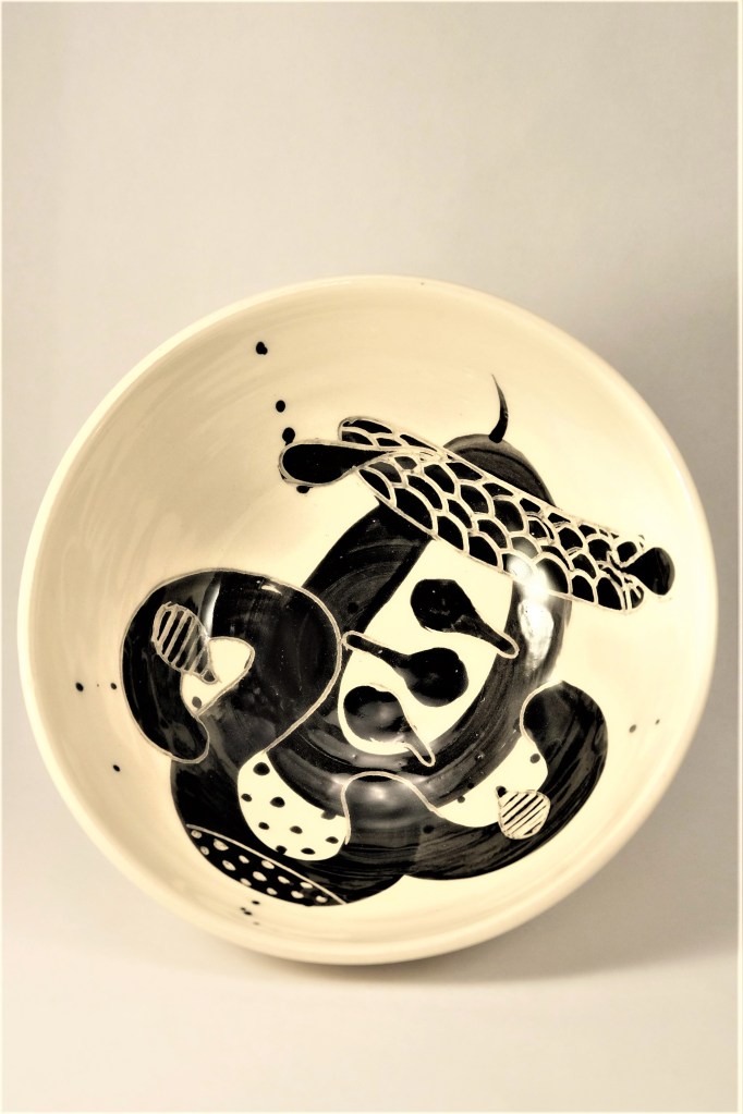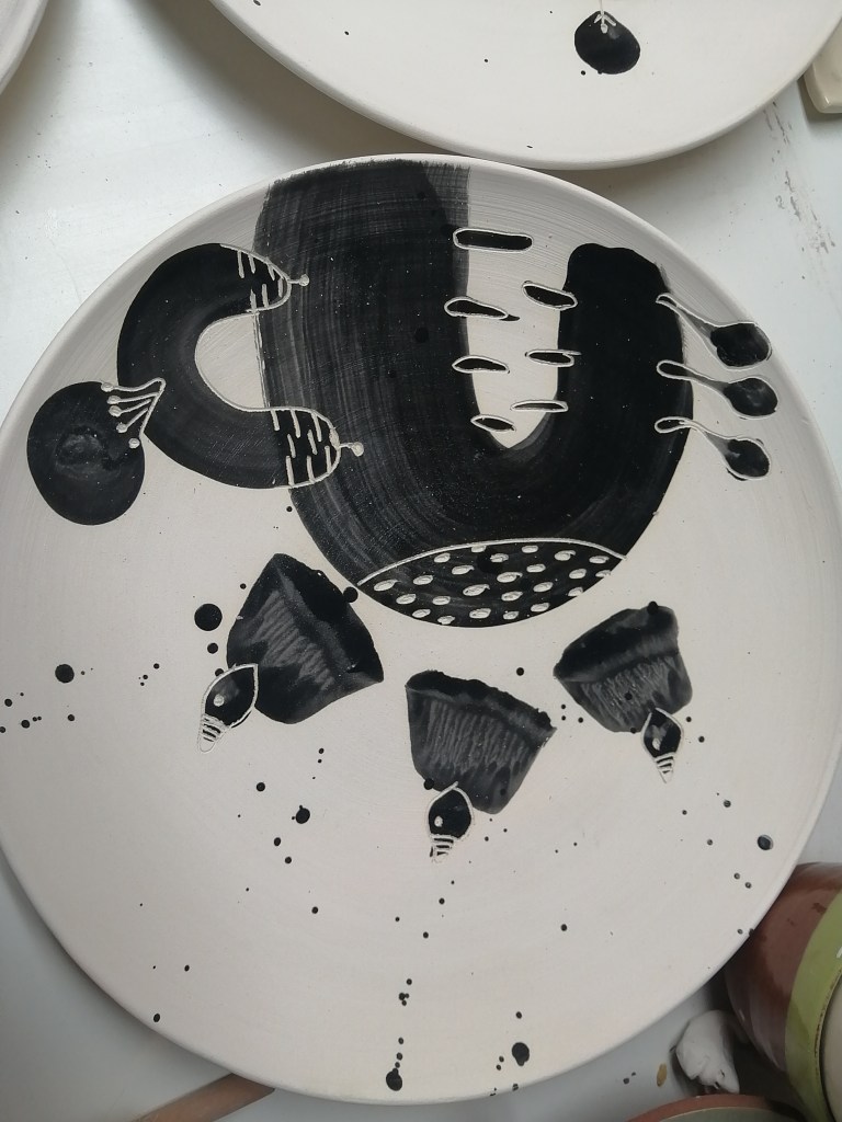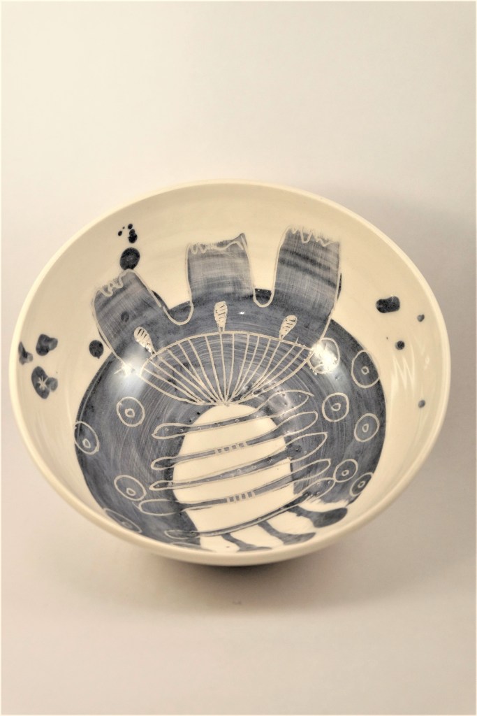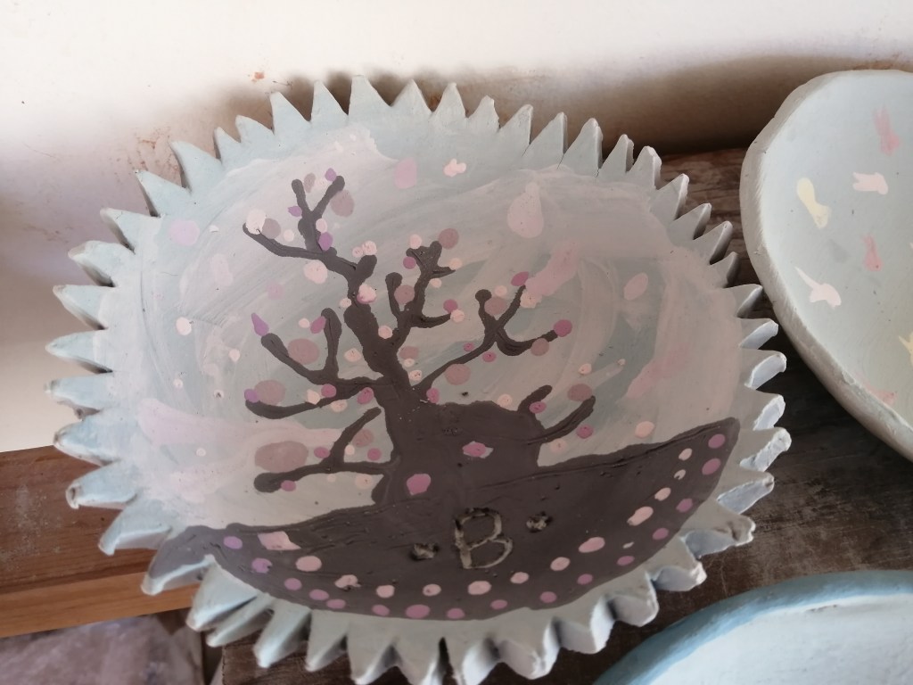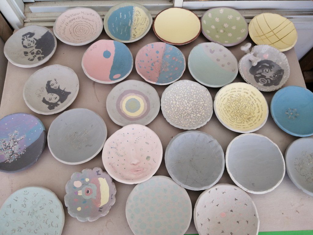 Etape de la couleur et de la gravure. Certaines élèves ont anticipé le dessin qu’elles voulaient graver dans le bol. entre projection et résultat, intéressant!