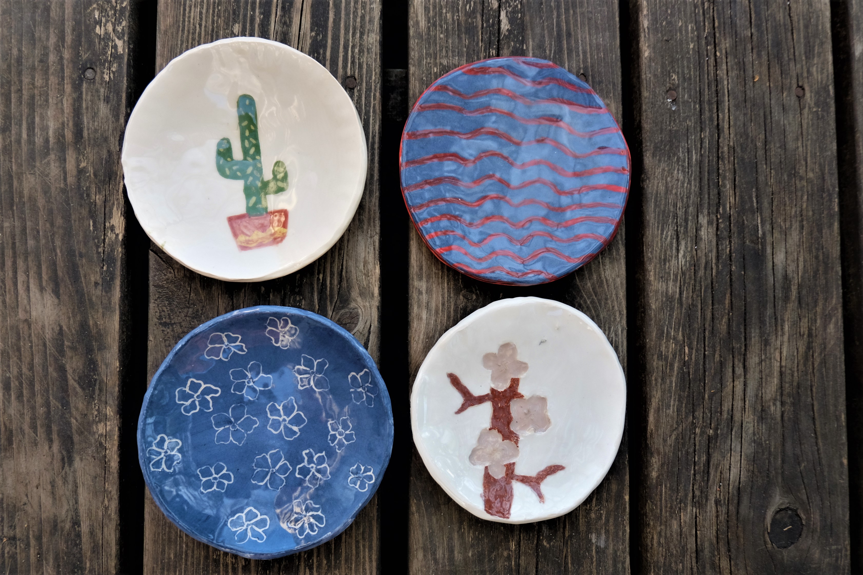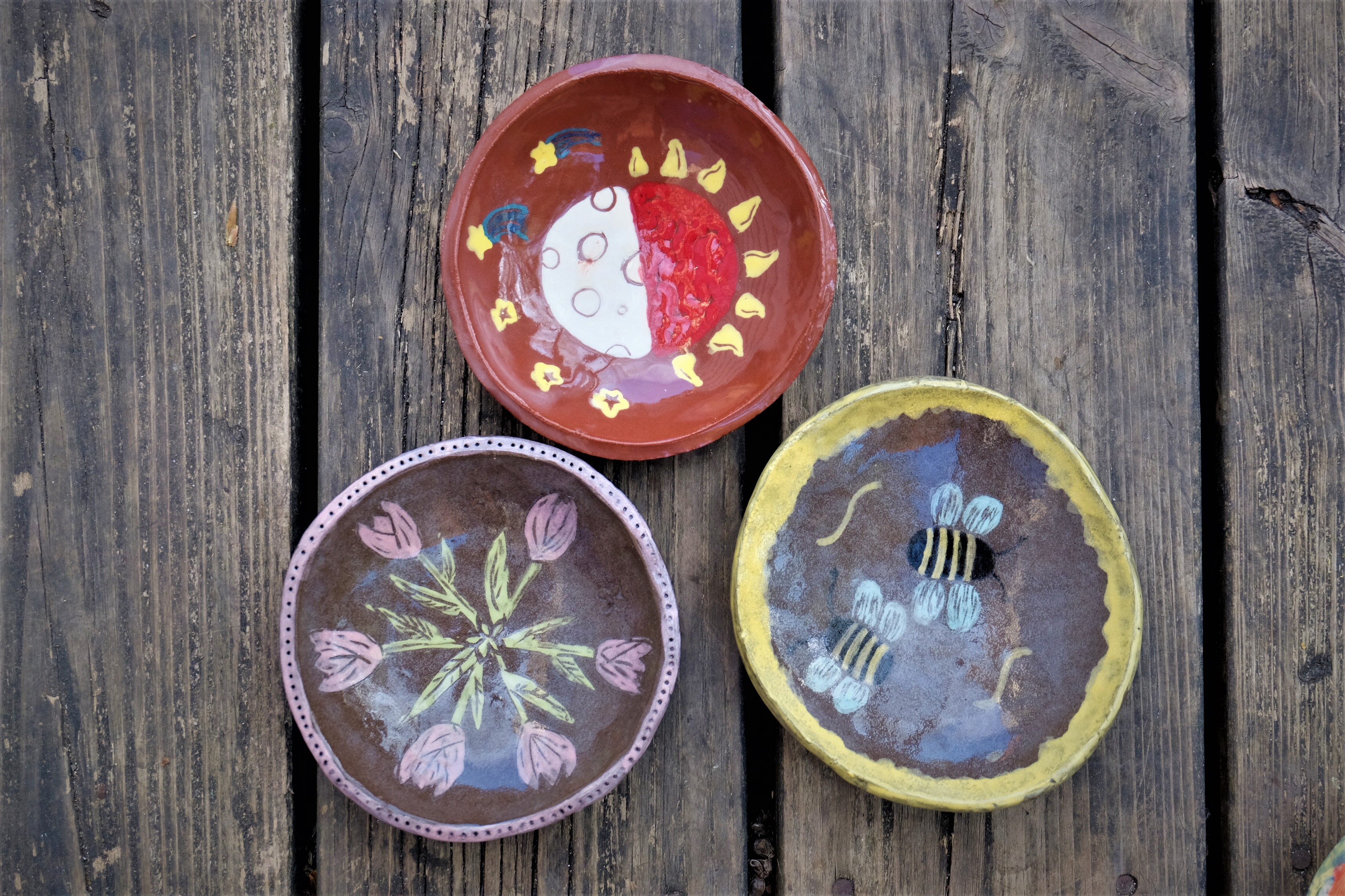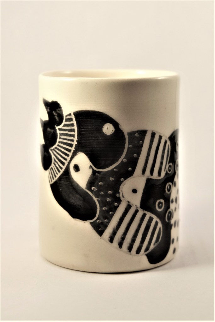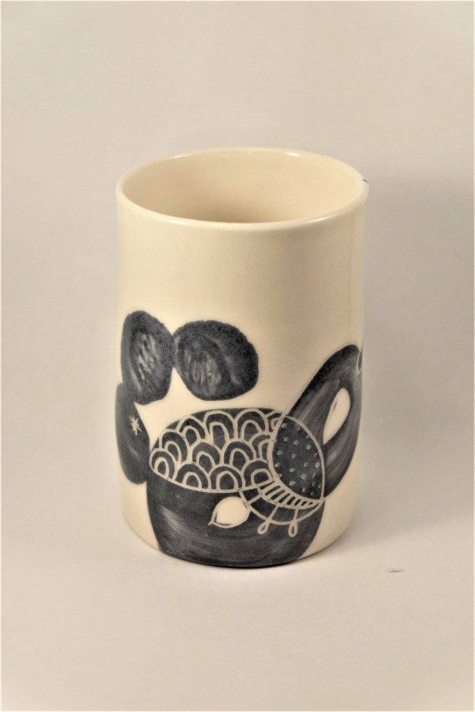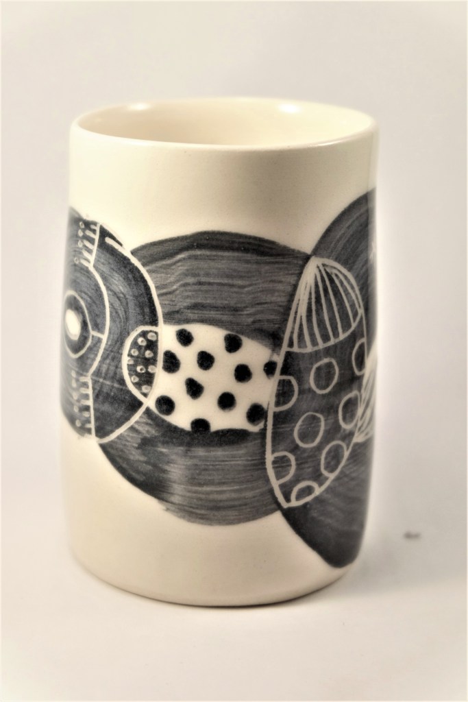 Etape de la couleur et de la gravure. Certaines élèves ont anticipé le dessin qu’elles voulaient graver dans le bol. entre projection et résultat, intéressant!
