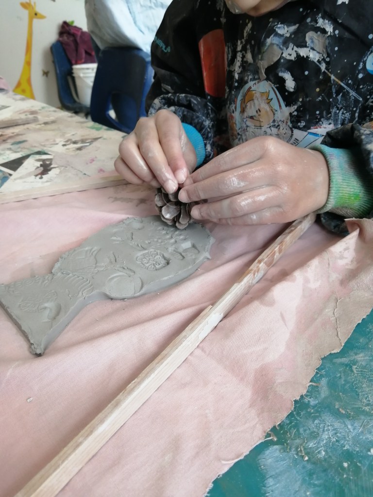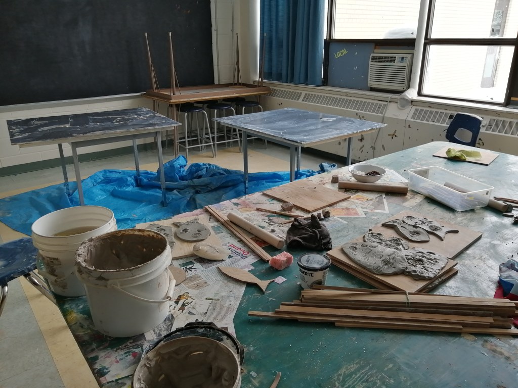 Une magnifique intervention auprès des élèves de l’école John Kennedy à Beaconsfield! Cette école accueille des enfants autistes, déficients, ayant de troubles de santé mentale et surtout une ouverture aux sensations! Pour les aider, des salles de relaxation, salle « sensorielle », des bains pour calmer certaines crises et des accompagnants, enseignants attentifs, à l’écoute des besoins de chacun dans un profond respect. Une belle équipe de travail encadre ces jeunes aux défis si particuliers. J’étais très heureuse de retrouver ce public avec lequel j’ai longtemps travaillé il y a quelques années. Rencontrer à nouveau des jeunes différents, avec une ouverture sensorielle exceptionnelle tant par leur refus parfois que par leur enthousiasme. J’ai proposé des ateliers de planche à barbotine pour proposer aux jeunes de jouer avec la terre liquide, dessiner sans enjeu de résultat, pour le plaisir du toucher, des sensations. Pour ceux qui le souhaitaient, il y a avait de la terre « en pâte » réaliser un poisson à la plaque avec des textures… Que de beaux moments.