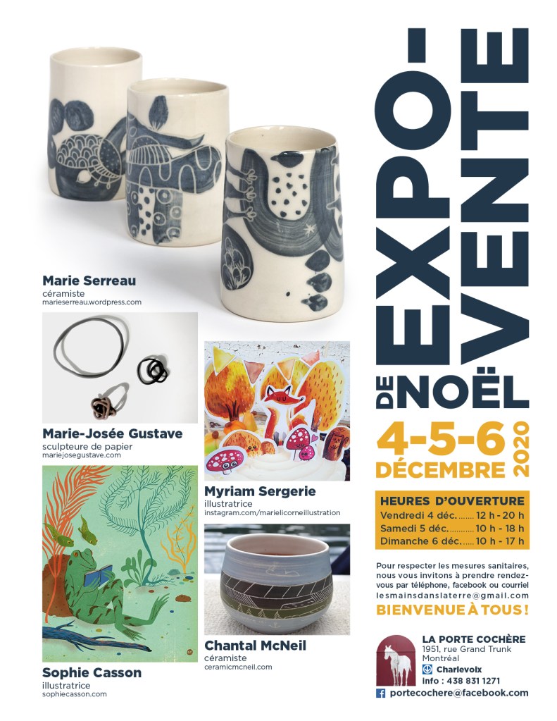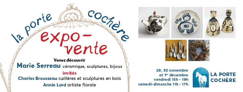 Vous y découvrirez une autre partie de mon travail céramique, bijoux, dessins, sculptures. J’invite cette année Charles Brousseau et ses cuillères, Annie Lord et ses couronnes florales de Noël.. de belles surprises, atelier de fèves pour les galettes et démonstration de fabrication de cuillères en bois.